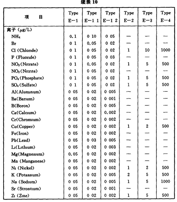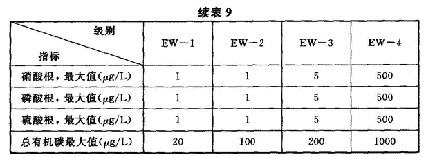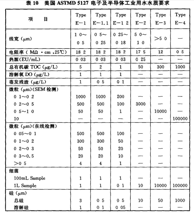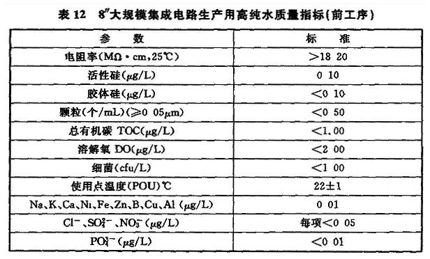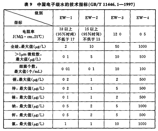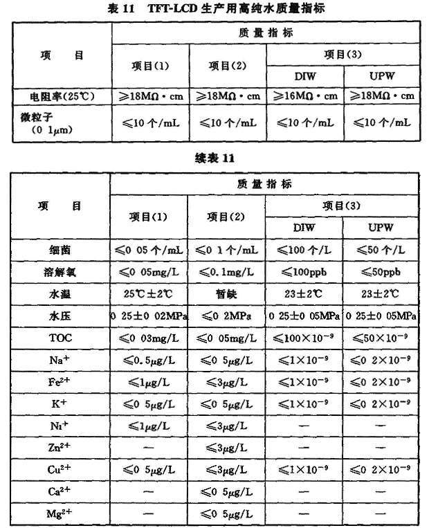 5 磁头生产用洁净厂房:磁头装配、溅射烧结等要求4级(0.1μm),研磨、检测等要求5级(0.1μm),切割等要求6级。 6 印制电路板生产用洁净厂房:6.5级、24±2℃、65%±5%。 7 锂电池生产的干作业洁净生产区:6级、23℃,露点(DP)-30℃;组装、测试洁净室(区):7级、23±2℃、≈20%。 8 等离子显示器(PDP)生产用洁净厂房:涂屏间等:5.5级、25±2℃,50%±10%;其他生产间:6.5~8级、20~26℃、55%±10%。3.2.4 现代电子产品生产的重要特点之一,在许多电子产品的生产过程中需使用高纯水、高纯气体和高纯化学品,且各类电子产品生产时,因品种不同、产品生产工艺也不同,对高纯物质的纯度、杂质含量的要求不同,它们之间差异很大。表9是中国电子级水的技术指标,表10是美国ASTMD5127电子及半导体工业用纯水的水质要求,表11是TFT-LCD生产用纯水水质要求,表12是一个8″集成电路芯片制造用高纯水水质要求。