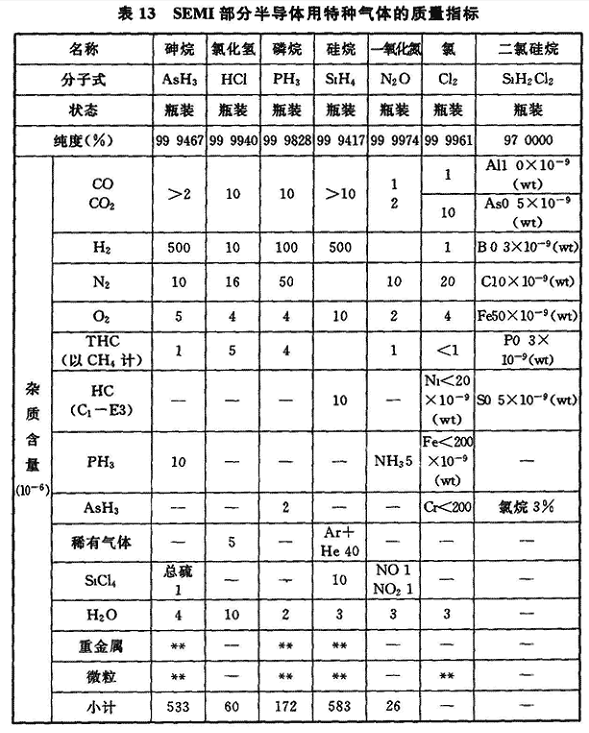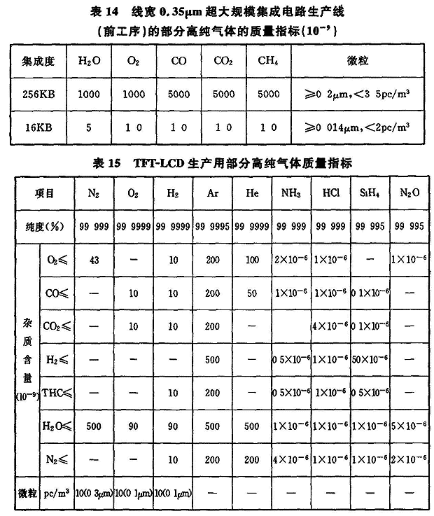 电子工业用高纯气体品种很多,高纯常用气体和特种气体达数十种,表13是SEMI部分半导体用特种气体的质量标准,表14是线宽0.35μm超大规模集成电路生产线(前工序)的部分高纯气体的质量指标,表15是 TFT-LCD生产用部分高纯气体质量指标。