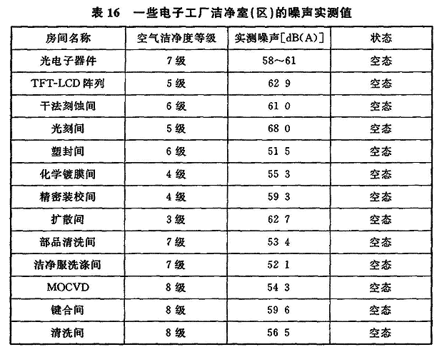 3.2.5近年来,对一些电子工厂的洁净室(区)内的噪声级(空态)的检测资料表明,大部分单向流洁浄室(区)内的噪声均可小于65dB(A),也有少数洁净室(区)由于各种原因,实际检测的噪声超过65dB(A)。非单向流洁净室(区)内的噪声大部分可小于60dB(A)。表16是部分电子工厂洁净室(区)内噪声的检测数据。