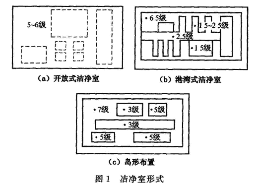 4.2.1 随着科学技术发展,近年来,电子产品生产用洁净室有多种形式,下面根据在电子工厂中已实际应用的各种类型的洁净室形式进行简要描述。1 根据电子产品生产工艺要求,空气洁净度等级和平面或空间布置要求,微电子厂房洁净室布置形式一般有隧道式或港湾式、开放式、岛形布置等,见图1。据调查表明,集成电路芯片制造用洁净室一般采用隧道式和开放式,其中隧道式洁净室主要用于5″、6″芯片制造厂,生产工艺设备跨洁净生产区和设备维护区,洁净生产区对洁净度要求严格,而维护区的空气洁净度等级较低。目前8″、12″芯片制造工厂普遍采用开放式洁净室加微环境(minienvironment)的方式,将芯片制造过程对空气洁净度要求十分严格的硅片加工过程(1~4级)布置在微环境装置内,而开放式洁净室的洁净度等级只需5~6级,这种洁净室形式既可做到工艺布置的灵活性,又可做到减少建设投资和降低能量消耗、降低运行费用等。