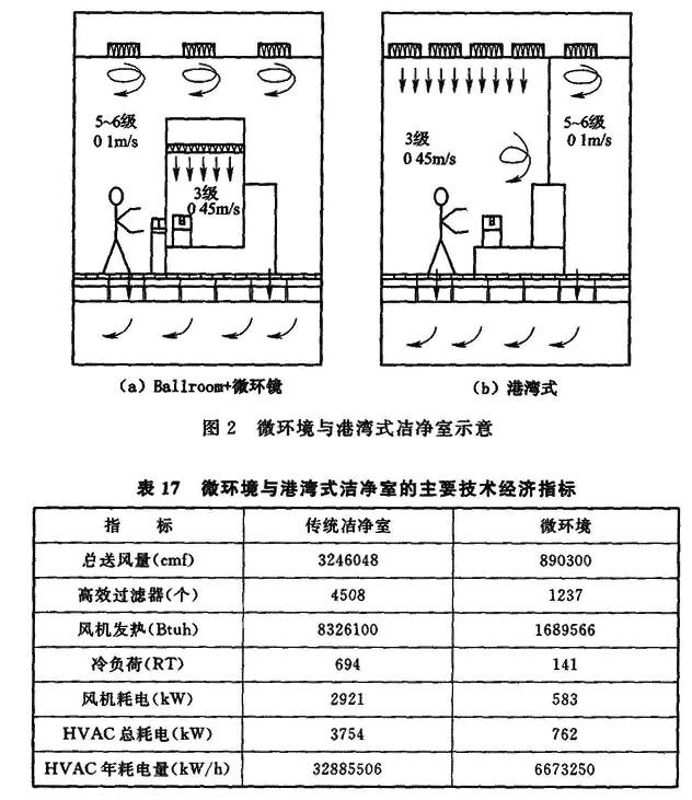 2 按气流流型划分洁净室时,可划分为单向流洁净室、非单向流洁净室和混合流洁净室。 1)单层洁净室,在单向流洁净生产区的上部、下部设有上下技术夹层,上技术夹层内设置空气过滤装置、风管和公用动力管线;下技术夹层为回风道。这种形式适用于规模较小的洁净室。 2)多层洁净室,在单向流洁净生产区吊顶格栅以上设有送风静压箱或循环空气处理设备或空气过滤单元机组等的上技术层;在单向流洁净生产区的活动地板以下设有回风静压箱或辅助生产设备或公用动力设备、管线等的下技术层。有的电子工业洁净厂房的下技术层根据需要可为一层或二层。 非单向流洁净室是采用非单向流气流流型的洁净室,主要用于空气洁净度等级为6~9级的洁净室,此类洁净室当单侧回风时其宽度一般不大于6m。混合流洁净室是在同一洁净室内,同时存在单向流和非单向流两种气流流型的洁净室(区)。4.2.2 制定本条的主要依据是: 1 近年来,在大规模集成电路生产(前工序)用洁净厂房、TFT-LCD生产用洁净厂房的建造、设计中,基本上采用多层的布置方式,在洁净生产层吊顶格栅以上的上技术夹层常常作为送风静压箱,洁净空气通过FFU向洁净生产层送风,实际上,洁净生产层与上技术夹层是相通的;而洁净生产层的下部是活动地板及其支撑件和钢筋混凝土多孔板,在活动地板等以下是作为回风静压箱的下技术夹层,在下技术夹层常常还设置一些公用动力设备、辅助生产设备和公用动力管线等,洁净生产层的回风通过活动地板、多孔板回至下技术夹层,实际上,下技术夹层与洁净生产层是相通的,所以可以认为:电子工厂洁净厂房垂直单向流洁净室的空间包括活动地板以下的下技术夹层,洁净生产层和吊顶以上的上技术夹层。 2 在美国国家消防协会(NFPA)的标准规范NFPA 318((洁净厂房消防标准》(Standard for the procection of cleanroom)(2000年版)的第1.5.5条中规定:“洁净室的范围包括活动地板下的下技术夹层和吊顶上面的上技术夹层。”同时在NFPA 318的总则中明确,该标准适用于半导体工厂的洁净室。4.2.3 电子工厂洁净厂房是能源消耗量大、建设投资大的厂房,为了使洁净厂房的建设获得较好的节能和经济效益,从洁净室型式的选择开始就应该认真地分析比较,选择既满足电子产品生产工艺要求,又能做到降低能耗、减少建设投资和降低运行费用等需求。目前在超大规模集成电路工厂采用微环境类型的洁净室,是一种能满足以上要求的混合流洁净室。图2是Ballroom+微环境洁净室与港湾式洁净室的对比图示,图中(a)将要求大面积的单向流平均风速为0.45m/s变化为只有微环境范围内小面积,而大部分空间均采用5~6级、平均风速约为0.1m/s。两种方式的主要技术经济数据的比较见表17,从表中数据可见:Ballroom+微环境洁净室能量消耗少,也可做到总体建设投资少,所以当空气洁净度等级要求十分严格时,宜采用此种类型。