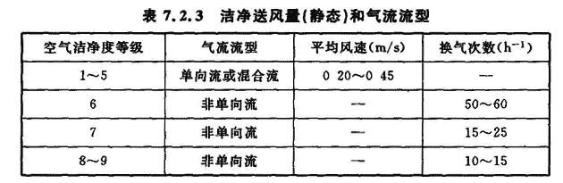 7.2.1 气流流型的设计,应符合下列要求: 1 气流流型应满足产品生产工艺和空气洁净度等级的要求。空气洁净度等级为1~5级时,应采用单向流或混合流;空气洁净度等级为6~9级时,宜采用非单向流; 2 洁净室工作区的气流流速应满足生产工艺和工作人员健康的要求。7.2.2 洁净室的送风量,应符合现行国家标准《洁净厂房设计规范》GB 50073的有关规定。7.2.3 洁净室(区)所需的满足空气洁净度等级的洁净送风量和气流流型,宜按表7.2.3计算。