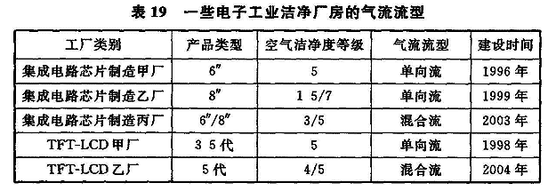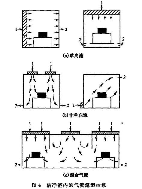 7.2.1 气流流型的确定应充分考虑的因素有:满足空气洁净度等级要求、一次建设投资、运行维护费、空气过滤器等更换方便等。本条推荐的洁净室(区)内气流流型的设计要求,是基于数十年电子工厂洁净厂房工作实践的经验总结,并结合国际标准化组织ISO/TC 209技术委员会已经颁布、实施的《洁净室及相关受控环境标准》IS0 14644—1、IS0 14644-4中有关气流流型的要求和近年来国内建成投产的电子工业洁净厂房所采用的气流流型的实际状况制定的。图4是IS0 14644-4中对洁净室气流流型的图示。表19是一些电子工业洁净厂房的气流流型。上述情况表明:空气洁净度等级为1~5级时,基本上采用单向流或混合流,空气洁净度等级为6~9级时,基本上采用非单向流,且混合流流型可应用于所有各种空气洁净度等级的洁净室。
