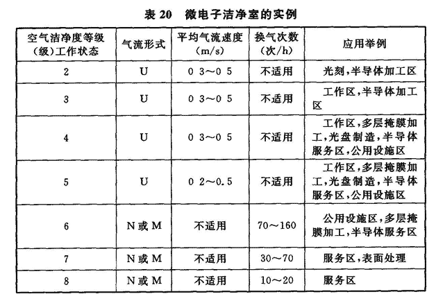 注:在制定最佳设计条件前,应该详细规定并商定与ISO等级有关的占用状况。 表列的气流形式表示该等级洁净室的气流特性U为单向流,N为非单向流,M为混合气流(U和N组合)。平均气流速度是通常规定洁净室内单向流的方法。对单向流速度的要求取决于局部的参数,如几何图形和热参数。不一定是过滤器的面速度。每小时换气次数是规定非单向流和混合气流的方法。建议的换气次数是指3.0m的室高度。应考虑不透水的屏障技术。污染源和待保护的区域要有效地分隔开,可以用物理或气流屏障。 2 近年来,一些8″、12″集成电路芯片生产用洁净厂房中主要生产设备配置微环境装置时,洁净室采用Ballroom+微环境时,其洁净厂房内洁净区的空气洁净度等级为5级或6级,气流流型为非单向流,洁净生产区送风一般选用FFU,吊顶上FFU的满布率为25%左右;微环境内的空气洁净度等级为2~4级。 3 单向流洁净室的平均风速下限值,在自动化、机械化程度很高的洁净室(区)内基本无人的情况下,有的洁净室(区)仅采用0.11m/s。