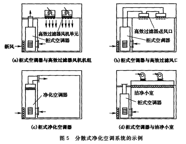 7.3.1 洁净厂房中的净化空调系统可分为集中式净化空调系统和分散式净化空调系统。净化空调系统的型式应根据洁净厂房的规模、空气洁净度等级和产品生产工艺特点确定。洁净室(区)面积较小或只有局部要求净化时,宜采用分散式净化空调系统,7.3.2 洁净厂房的洁净室(区)送风方式可分为集中送风、隧道送风、风机过滤器机组送风等。应根据洁净室(区)使用功能和降低能量消耗的要求,经技术经济比较,采用运行经济、节约能源的送风方式。7.3.3 净化空调系统新风的室外吸入口位置,应远离本建筑或其他建筑物排放有害物质或可燃物的排气口。7.3.4 多套净化空调系统同时运行或较大型电子工业洁净厂房的净化空调系统的新风,应集中处理。7.3.5 净化空调系统设计应合理利用回风,但下列情况不得回风: 1 在生产过程中向车间内散发的有害物质超过规定时; 2 采用局部处理不能满足卫生要求时; 3 对其他工序有危害或不能避免交叉污染时。7.3.6 净化空调系统需设置电加热时,应选用不产尘的电加热器,且应布置在高效过滤器的上风侧,并应采取安全保护措施。7.3.7 净化空调系统的电加湿器应采取安全保护措施。7.3.8 根据气象条件,存在冷冻可能的地区,新风系统应采取防冻保护措施。条文说明7.3 净化空调系统