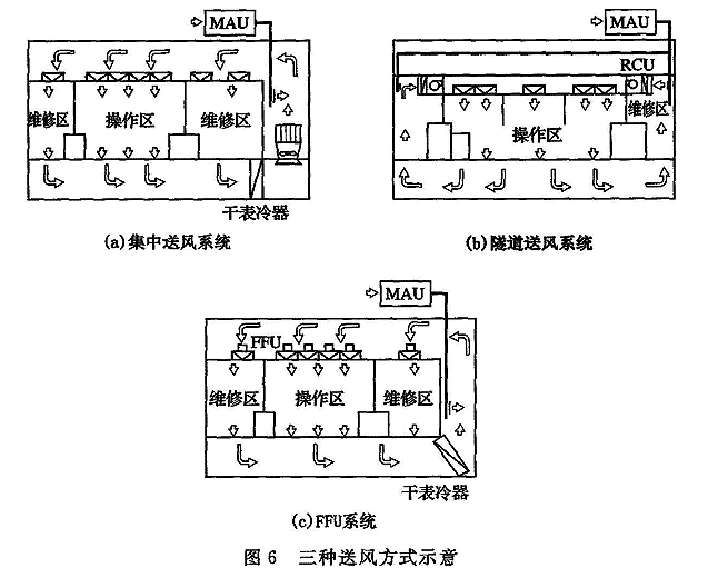 7.3.2 电子工业洁净厂房,尤其在规模较大的集成电路芯片生产和TFT-LCD生产用洁净厂房的送风方式有集中送风、隧道送风和风机过滤机组送风等类型,各种送风方式各具特点和适用性,图6是各种送风方式的示意图。图6中:(a)集中送风系统(CentralSystem),室外新风经新风处理装置(MAU)后,与经表冷器降温和风机增压后的回风混合,通过高效过滤器送至洁净生产层。(b)隧道送风系统(Tunnel System),洁净区的回风经维修区与新风处理(MAU)后的新风混合后,由循环空气处理装置送入送风静压箱,通过空气过滤器送入洁净区。(c)FFU系统,洁净区回风经表冷器降温后与处理后新风混合,通过FFU增压、过滤送入洁净区。三个系统各有利弊,其选择主要与电子产品生产工艺、能量消耗、建设投资等有关,有时也与业主的意愿有关,但近年来在集成电路洁净厂房中,采用FFU系统者日益增多。