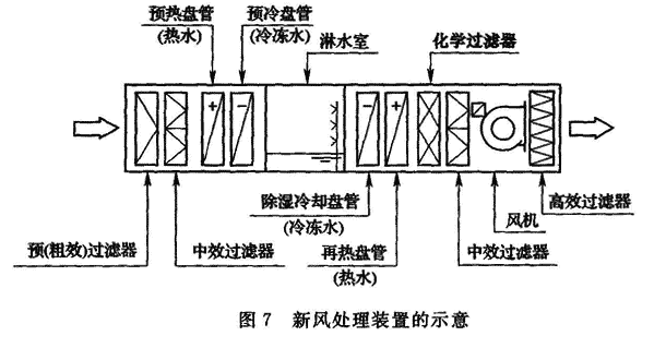 7.3.3 在一些电子产品生产过程中,需使用各种不同的可燃、有毒气体或化学品,使用这些物质的生产设备或储存、分配设施都将设置必要的排风装置,为此,在这类电子产品生产用洁净厂房的净化空调系统的新鲜空气吸入口,必须远离上述排气口,以确保洁净室(区)的安全运行和工作人员身体健康。 美国消防协会发布的NFPA318((洁净室消防标准》的第3.1.1条规定,洁净室的室外空气吸入口的位置必须避免吸入本建筑或装置产生的可燃气体或有毒化学品。7.3.4 近年在电子工业洁净厂房中,当设有多套净化空调系统或洁净厂房规模较大时,常常采用新风集中处理的方式,采用这种方式的特点或优越性主要有: 1 将送入洁净室的空气净化与热湿处理分离,有利于降低能源消耗; 2 有利于消除冷热抵消; 3 有利于强化对室外新风的处理,在微电子、光电子用洁净室的送风中,不仅要求控制微粒、温度、相对湿度等,还要求去除影响产品质量或降低成品率的分子态化学污染物,如Na、SOx、NOx、Cl、B等,这些污染物主要来自室外大气中。为此,对于此类洁净厂房需对室外吸入新鲜空气进行严格处理,常常可以采用淋水法去除大气中的SOx、NOx和Cl;采用化学过滤器和活性炭过滤器,利用物理吸附和化学吸附的原理,将低浓度的分子态化学污染物去除到规定的浓度要求。图7是某微电子工业洁净厂房的新风处理装置示意图,采用了11个功能段——两级加热、两级表冷、两级淋水、四级过滤和一级加湿。7.3.5 洁净厂房净化空调系统的设计,若能在满足工作人员必须的新鲜空气量的前提下将洁净室的回风基本得到合理利用,是最佳的运行方式,这样可以大大降低新风处理所需加热、冷却用能量和输送用能量,是洁净室设计中最佳节能措施。所以本条规定除了三种情况不得回风外,其余均应合理利用回风。