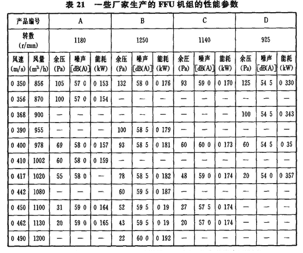7.4.1 电子工业洁净厂房的净化空调系统的核心设备之一的空气过滤器的正确选用和合理布置,是至关重要的。首先,应遵循我国的相关国家标准、行业标准合理选用空气过滤器,包括空气过滤器的处理风量、效率、阻力、材质和检测方法(含检漏方法)等。其次,根据具体工程项目的产品生产要求和净化空调系统设计,合理安排各类空气过滤器的位置,在空调箱中,中效(高中效)空气过滤器常安装在正压段,但近年来为了保持表冷器表面清洁,减少尘粒沉积,已有许多设计中在风机前安装中效空气过滤器,图7便是一例。鉴于目前我国的相关标准中还没有去除化学污染物的空气过滤器或其他去除装置的标准,只能参照相关国际标准进行选用和布置。7.4.2 风机过滤机组(FFU)是将风机与高效过滤器(HEPA)或超高效过滤器(ULPA)组合在一起,构成自身可提供推动力的末端空气净化装置。它由风机、过滤器、机壳和电器控制等部分组成。FFU的主要技术性能包括风量(一般以断面风速表示)、余压、能耗、效率、噪声和控制方式等。目前国内电子工业洁净室应用FFU越来越多,不仅在大面积、空气洁净度要求严格的单向流或混合流洁净室(区)采用,而且在各种用途的、面积不是很大的单向流或混合流洁净室(区)中也有应用。目前在应用中受到各方面关注的主要是FFU装置的经济性(投资、运行费)、风量和余压、噪声、能耗等性能参数,表21是对国内市场的几个制造厂家生产的FFU装置的实测性能参数。