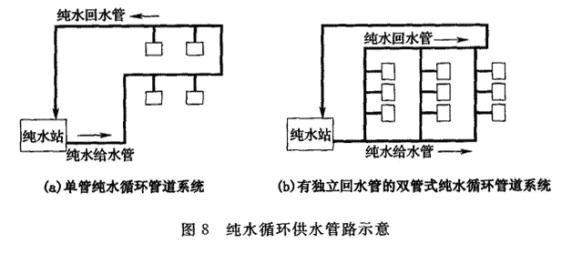 9.2.2 纯水的制备、储存和输送设备的选型和制造材质的选择,除了应充分满足电子产品生产工艺对供水水质、终端水质的要求外,纯水的制备、储存和输送设备的选型和材质选择,还应充分考虑下列因素: 1 纯水是一种极好的溶剂,为了确保在纯水的制备、储存和输送过程中纯水水质下降最小,必须选择化学稳定性极好的材料,这些材料在所处的纯水中的溶出物最小。各类材料的溶出物多少应以材料的溶出试验确定,主要包括金属离子、有机物的溶出。 2 设备内壁光洁度好,若内壁有微小的凹凸,会造成微粒的沉积和微生物的繁殖,导致微粒和细菌两项指标的不合格。不锈钢内壁光洁度可达几微米至几十微米,内衬PVDF的内壁光洁度可达1μm以下。 3 设备内壁以及接管处应平整、光滑,以防止产生流水的涡流区,避免污染物积聚。 4 设备内不应有“死水区”、“存水弯”等可能形成不流动水的“死角”、“盲点”等,防止水质降低,避免微生物的滋生。 5 纯水的储罐等设备的上部空间,为防止发生渗气现象等,应充以纯氮保护。 6 应设有检查口、清洗口,以便对设备进行定期检查、清洗,防止长期运行后,内壁产生沉积物及微生物积聚使水质下降。为此,本条作了纯水的制备、储存和输送设备,应符合电子产品生产工艺的要求,并应符合规定的三款要求。9.2.3 电子工业洁净厂房的纯水系统设计和运行经验表明,采用纯水循环供水方式是确保纯水水质的安全、方便和可靠的方法,也是目前各类电子工业洁净厂房纯水系统的实际设置状况,图8是单管式循环供水系统和有独立回水管的双管式循环供水系统。在集成电路芯片生产等对纯水水质要求严格的电子产品生产工艺用纯水供水系统,目前均采用双管式循环供水系统。