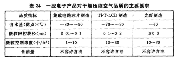 10.3.1 干燥压缩空气系统是电子工厂中的一种重要动力源,它用于许多电子产品生产工艺设备气动设备或仪器仪表的动力气源,一旦供气量不足或供气品质下降,都将影响产品生产过程的正常进行,严重时还将停产,故本条对电子工业洁净厂房中的干燥压缩空气系统作了相关的规定。 1 应按生产工艺、公用动力系统对于燥压缩空气品质、消耗量确定设计规模。为确保生产工艺供气的安全、可靠、稳定性要求,应留有合理的富余量。当产品生产过程要求不能中断供气或中断供气将会引起安全事故时,应设置一定的备用供气装置等。 2 电子产品生产过程对干燥压缩空气的含水量(或露点)、含油量、微粒粒径及其浓度的要求较为严格,表24是一些电子产品生产工艺对干燥压缩空气品质的主要要求。