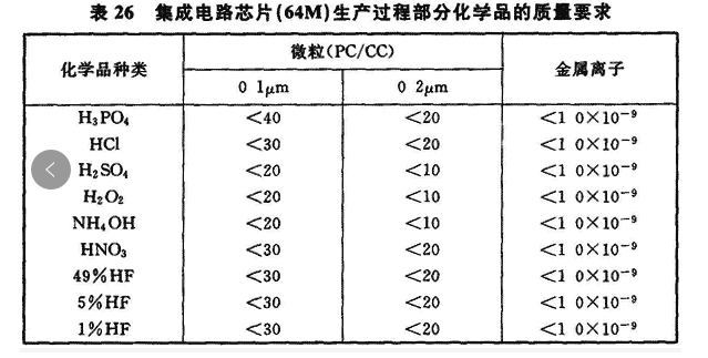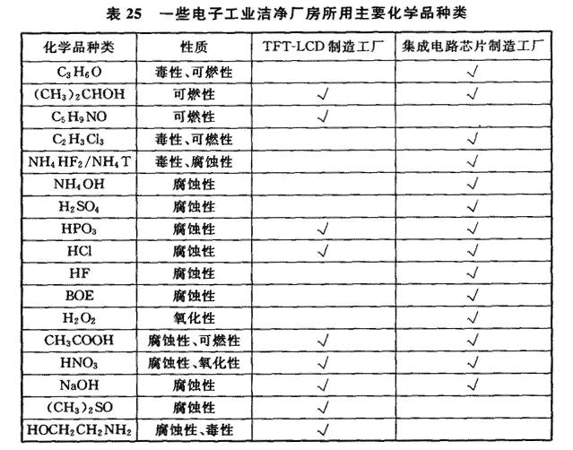 11.1.1 电子工业洁净厂房常常需使用各种化学品,根据电子产品品种及其生产工艺的不同,各种电子产品生产所使用的化学品是不相同的,其中以集成电路芯片制造过程、TFT—LCD生产过程所需的化学品品种多,有的纯度要求严格,表25是这两种电子产品生产用洁净厂房内所用的主要化学品种类。表26是有关资料提出的集成电路芯片64M生产过程部分化学品的质量要求。