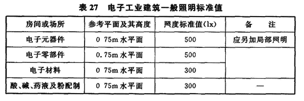 12.2.1 根据现行国家标准《建筑照明设计标准》GB 50034—2004中的规定,照度值均为作业面或参考平面上的维持平均照度值。该标准第5章中规定了各类建筑的照明标准值,现将其中有关电子工业的部分摘录于表27中。
