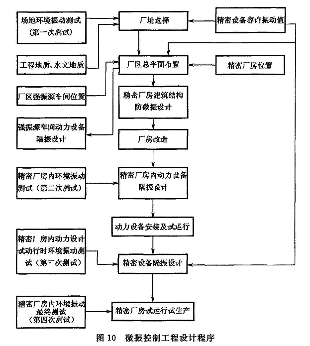 15.3.1 电子工业洁净厂房中微振控制设计,应按图10所示的程序进行。工程实践表明,该程序是电子工厂,特别是微电子工厂洁净厂房中微振控制设计的有效程序。图中指出的四次测试就是本条制定的依据。15.3.2 有微振控制要求的洁净室(区)的建筑结构设计是微振控制设计的重要部分。实践表明,大量的环境振动能量是通过建筑结构传递到精密设备、仪器的基础底部,所以建筑结构的微振动控制设计的基本要求是:建筑物的基础应尽可能地置于坚硬土层上或置于动力特性良好的地基上,并且基础应具有足够的刚度;设置独立的建筑结构微振动控制体系,并与厂房主体结构脱开,减少厂房主体结构振动的影响;厂房的主体结构还应根据微振动控制的需要,在可能情况下,适当增大结构截面尺寸,增加整体建筑的刚度。建筑结构微振动控制体系的内容,随不同电子产品的生产工艺要求有所不同,如集成电路芯片生产用洁净厂房的建筑结构微振动控制体系包括:独立于厂房主体结构的基础,一般采用深基础或复合地基,以确保基础具有足够刚度和较少沉降量,设置防微振平台,该平台与主体结构脱开,并应具有较大的质量及较好的刚度,平台下支撑柱一般采用较小的柱距;在防微振平台下,一般设必要的防微振墙,以减弱水平向振动的传递;微振动控制体系底部一般设置厚重地面层等。根据上述要求和工程实践制定本条规定。