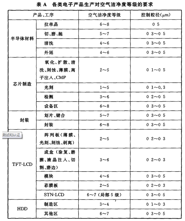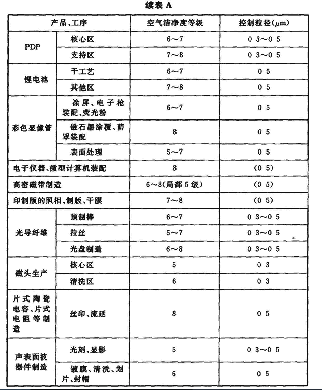 附录A 各类电子产品生产对空气洁净度等级的要求
