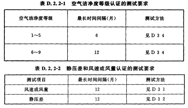 D.2.1 确认洁净室(区)符合本规范要求,应进行下列基本测试: 1 空气洁净度等级测定; 2 静压差; 3 风速或风量。D.2.2 空气洁净度等级、静压差、风速或风量的认证测试的最长时间间隔应符合表D.2.2—1和表D.2.2—2的规定。