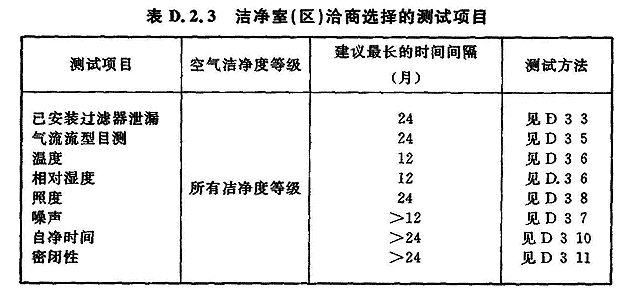 注 1 若洁净室(区)运行中已对粒子浓度、风速、静压差进行连续监测,且其测试值均符合本规范要求时,认证的测试时间间隔可延长。具体间隔时间,可与认证单位洽商。 2 空气洁净度等级认证,可在静态或动态检测,洽商确定, 3 风量测定,应采用风速计在风口或风管测定。D.2.3 电子工业洁净室(区)的认证测试,除空气洁净度等级、静压差、风速或风量测试外,还应根据需要进行表D.2.3规定的洽商选择测试项目。