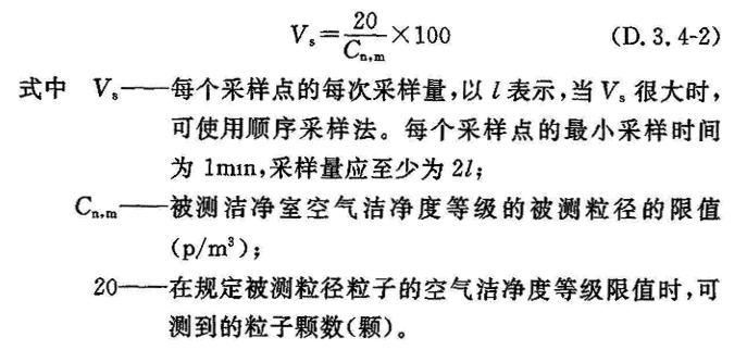 D.3.1 风量或风速测试,应符合下列规定: 1 对于单向流洁净室,应采用截面平均风速和截面乘积的方法确定送风量,并应取离高效过滤器300mm垂直于气流的截面作为测试平面。应将测试平面分成相等的栅格,每个栅格尺寸应为600mm×600mm或末端空气过滤器尺寸,测点应在栅格中心或不应少于3点。每一点的测试时间不应少于10s。应记录平均值、最大值和最小值,并应以算术平均值作为平均风速。 2 对于非单向流洁净室,每一点的测试时间不应少于10s。 3 在每个末端空气过滤器或散流器处,应采用风口法、风管法、风罩法等测量送风风速确定送风量,每个测试位置的测点数不应少于3点。D.3.2 静压差测试,应符合下列规定: 1 静压差的测定应在所有的门关闭时进行。 2 仪器宜采用各种型式的微压计,仪表灵敏度应小于1.0Pa。 3 洁净厂房有多个洁净室(区)时,应从最里面的房间与相邻房间的压差测试开始,并应按顺序向外进行检测。D.3.3 已安装的空气过滤器泄漏测试,应符合下列规定: 1 仪器应使用采样量大于1 l/mm的光学粒子计数器。 2 应在过滤器上风侧引入大于等于0.1μm(0.5μm)粒子,粒子浓度应大于3.5×107P/m³的大气尘或其他气溶胶;在过滤器下风侧应用粒子计数器的等动力采样头放在距离被检过滤器表面20~30mm处,并应以5~20mm/s速度移动。应检测包括过滤器的整个面和过滤器周边、过滤器框架及其密封处的扫描。D.3.4 洁净度的检测,应符合下列规定: 1 应使用采样量大于1 l/min光学粒子计数器,应根据粒径鉴别能力、粒子浓度适用范围和计数效率等要求选用仪器。仪器应有有效的标定合格证书。 2 最少采样点应按下式计算: NL=A0.5 (D.3.4—1) 式中 NL——最少采样点; A——洁净室或被控洁净区的面积(㎡)。 采样点应均匀分布于洁净室(区)的整个面积内,并应位于工作区的高度。 3 每一采样点的每次采样量应按下式确定: