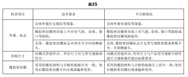 用目测检查沟槽式管接件壳体和橡胶密封圈的外观、标志及铸件质量等。
