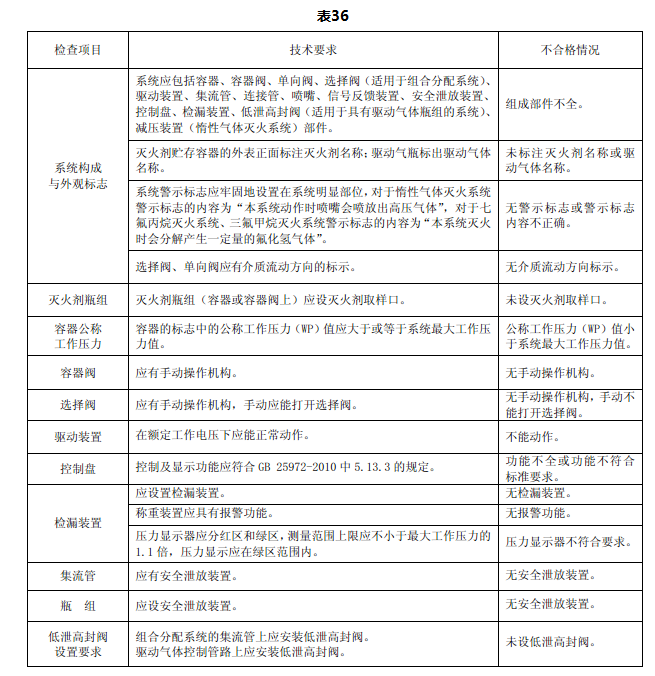 6.4.1.2.1.1 检查系统是否包括容器、容器阀、单向阀、选择阀(适用于组合分配系统)、驱动装置、集流管、连接管、喷嘴、信号反馈装置、安全泄放装置、控制盘、检漏装置、低泄高封阀(适用于具有驱动气体瓶组的系统)、减压装置(惰性气体灭火系统)部件。