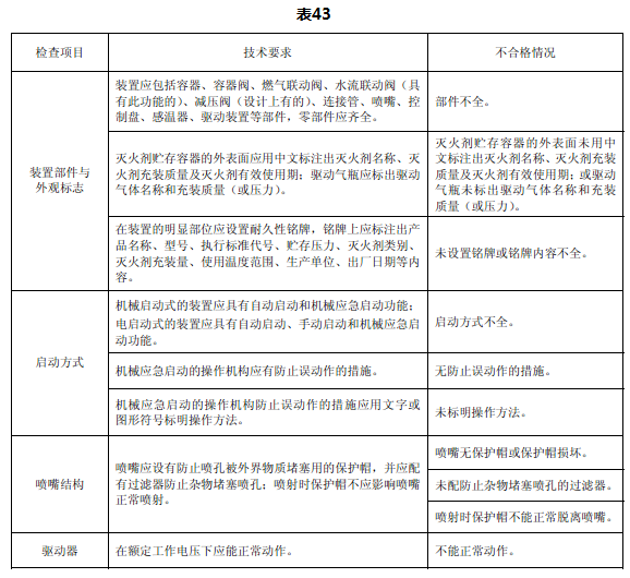 6.4.8.2.1.1 检查装置是否包括容器、容器阀、燃气联动阀、水流联动阀(具有此功能的)、减压阀(设计上有的)、连接管、喷嘴、控制盘、感温器、驱动装置等部件。