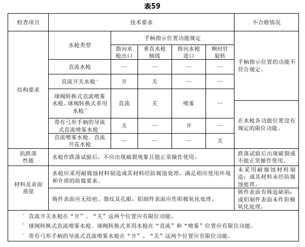 6.11.1.2.1 目测检查消防水枪各操纵机构动作及限位的情况、指示标记、材料及表面质量。直流喷雾水枪﹑直流开花水枪,其调节喷雾角和开花角的旋转开关的旋转方向可从水枪的进水口观察。