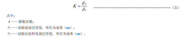 在已施工涂料的构件上,随机选取三个不同的涂层部位,分别用磁性测厚仪测量其厚度δ1。然后点燃2L汽油喷灯分别对准选定的三个位置,喷灯外焰应充分接触涂层,供火时间不低于10min。停止供火后观察涂层是否膨胀发泡,用精度为游标卡尺测量其发泡层厚度δ2。膨胀倍数按公式(3)求得,