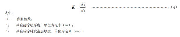 在已施工涂料的构件上,随机选取三个不同的涂层部位,用磁性测厚仪测量其厚度δ1。然后点燃2L汽油喷灯分别对准选定的三个位置,喷灯外焰应充分接触涂层,供火时间不低于5min。停止供火后用游标卡尺测量其发泡层厚度δ2。膨胀倍数按公式(4)求得,结果以三个测试值的平均值表示: