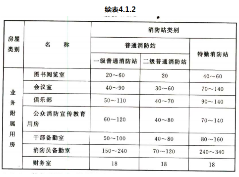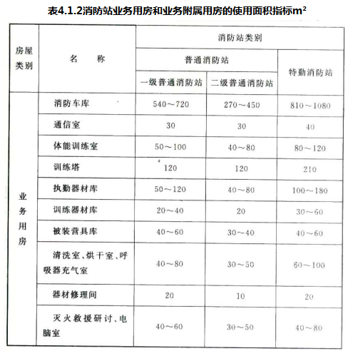 4.1.2 参照《城市消防站建设标准》建标152—2011,本条规定了消防站各种业务用房和业务附属用房的使用面积指标。其中,建筑用房的使用面积均不包括走道面积。