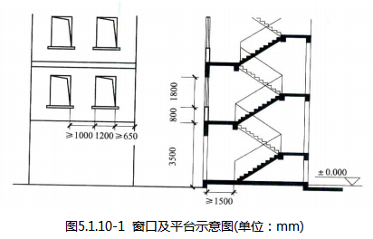 5 训练塔正面的窗口每层不应少于两个,窗口距塔边水平距离不应小于0.65m,窗间墙的宽度不应小于1.0m(图5.1.10-l)。
