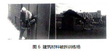 5.1.14 破拆训练场是进行破拆装备实际操作训练的小型区域,一般利用钢筋混凝土梁、柱、楼板、砖石等搭建成建筑废墟。墙体可采用木结构墙体、砖石砌体或钢筋混凝土墙体,也可利用防盗门、卷帘门、窗户栅栏、钢结构围栏等构造破拆训练墙,如图6。