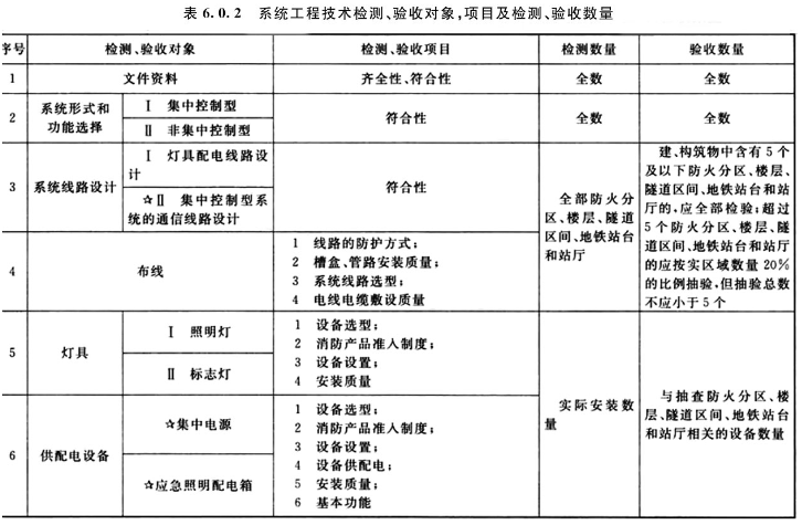 6.0.1 系统验收是对系统设计符合性的全面核查、是对施工质量的全面检查、是对系统部件功能及系统功能的全面检验,只有通过系统验收才能有效确保系统的选型和设置满足本标准和设计文件的要求,才能确保系统在火灾等紧急情况下能够可靠应急启动发挥应有的消防功能、保障人员的安全疏散。因此,将本条文确定为强制性条文,必须严格执行。6.0.2 本条规定了系统检测、验收的对象、项目和数量要求,系统的检测、验收应按附录E规定的检查要求和检查方法进行,并按照附录E的规定填写记录。6.0.3 本条规定了系统检测、验收时应具备的资料要求,资料的齐全性和符合性检查应按附录E规定的检查要求和检查方法进行,并按照附录E的规定填写记录。6.0.4 本条根据各项目对系统工程质量影响严重程度的不同,将检测、验收的项目划分为A、B、C三个类别。 1 按照设计文件的规定选择相应规格、型号、技术性能的产品,是保障系统运行稳定性和可靠性的基本要求;系统产品符合消防准入制度的要求是《中华人民共和国消防法》的明确规定;应急照明控制器的应急启动功能、标志灯指示状态改变控制功能,集中电源或应急照明配电箱的分配电输出功能,集中电源或应急照明配电箱的连锁控制功能,灯具应急状态的保持功能是在火灾等紧急状态下确保系统灯具可靠发挥应急照明和疏散指示功能的基本要求;集中电源或应急照明配电箱的分配电输出功能是保障系统正常运行的基本要求,上述项目不符合相关要求将严重影响系统运行的稳定性和可靠性,因此,将上述项目定为A类项目; 2 核查本标准6.0.3条规定资料的齐全性和符合性是检验系统施工、调试环节质量管理情况的一种主要方式,而且系统部件的现场设置记录、系统控制逻辑编程记录等技术资料是系统日常管理维护必不可少的参考资料,这些技术资料的不齐全、不符合将在很大程度上影响系统维护管理工作的有效开展;系统灯具的蓄电池电源是确保灯具保持应急工作状态的后备保障性电源,如果系统灯具的蓄电池电源容量不满足要求,存在人员尚未完全安全疏散时灯具的光源因供电中断而熄灭的隐患,在很大程度上影响系统功能的发挥,因此,将上述项目定为B类项目。6.0.5 本条规定了系统检测、验收结果的判定准则。该判定准则是判定系统部件的选型和设置、施工质量、系统部件功能和系统功能是否符合设计文件及本标准相关要求的判定标准,是判定系统是否具有持续维持稳定、可靠运行能力的判定标准,是判定系统检测、验收结果合格与否的直接依据。因此,将本条文确定为强制性条文,必须严格执行。6.0.6 系统检测、验收过程中,对功能不符合要求的系统部件应予以更换、对不符合要求的项目应进行整改,系统部件更换或项目整改后,应对相关项目重新进行检测、验收,直至所有检测、验收的项目均符合本标准的相关要求。对有抽检比例要求的项目,为了全面检验该类项目的施工质量、系统部件和系统的功能,首次检测、验收不合格需进行再次检测、验收时,该类项目的抽检比例应加倍。