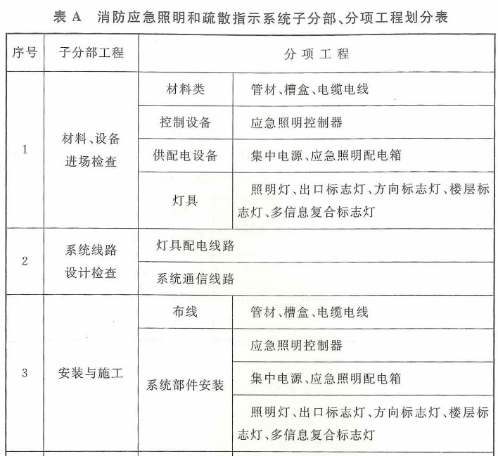 附录A 消防应急照明和疏散指示系统子分部、分项工程划分