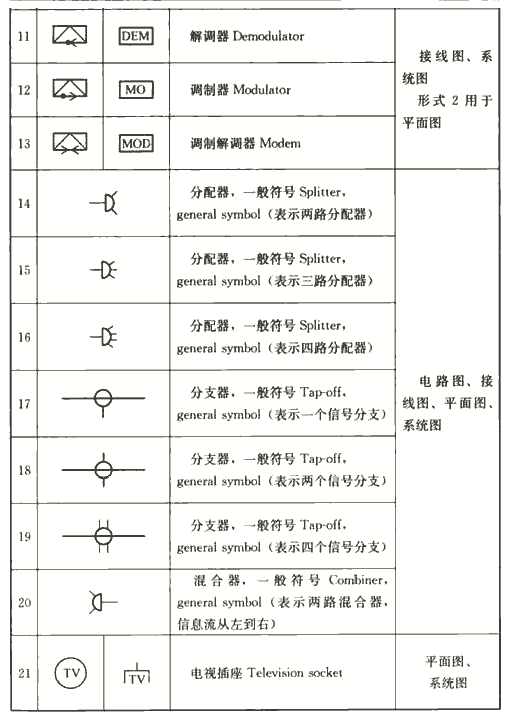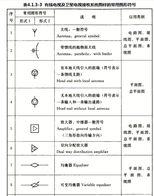 有线电视及卫星电视接收系统图样宜采用表4.1.3-3的常用图形符号。
