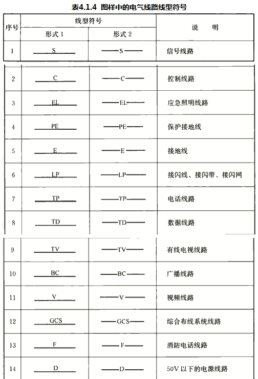 当图样中的电气线路采用实线绘制不会引起混淆时,电气线路可不采用表4.1.4所示的线型符号。例如当综合布线系统单独绘制时,其线路可采用实线表示,其间或其上不用加GCS标注。