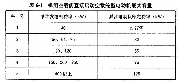 当有电梯负荷时,在全电压启动最大容量笼型电动机情况下,发电机母线电压不应低于额定电压的80%;当无电梯负荷时,其母线电压不应低于额定电压的75%。当条件允许时,电动机可采用降压启动方式。