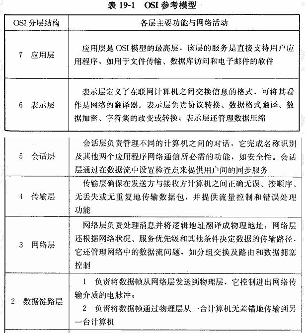 1)OSI参考模型是网络最基本的规范。描述如表19-1所示。
