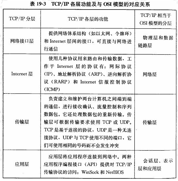 Internet协议(IP)是一种包交换协议,它完成寻址和路由选择功能;传输控制协议(TCP)负责数据从某个节点到另一节点的可靠传输,它是一种基于连接的协议。由于TCP/IP的开发早于OSI模型的开发,它与七层OSI模型的各层不完全匹配,TCP/IP分为四层,各层的功能以及与OSI模型的对应关系参见表19-3。
