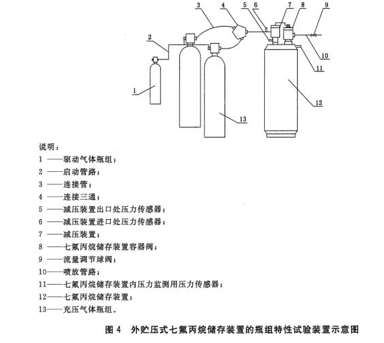 测试系统如图4所示。七氟丙烷储存装置所对应的充压气体瓶组的充装压力和数量应与设计一致;七氟丙烷储存装置内装不含有影响喷放的杂质的试验用水,试验用水充装体积与试验容器规格相对应的灭火剂最大充装量的体积相同。