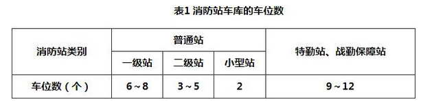 注:小型站车库的车位数不含备用车位,其他消防站车库的车位数含1个备用车位。在条件许可的情况下,车位数宜优先取上限值。