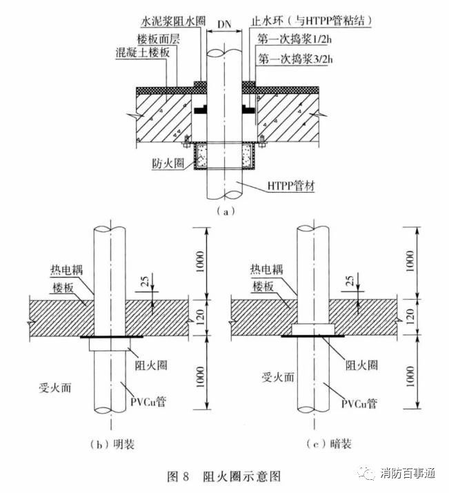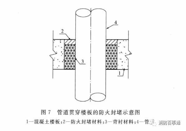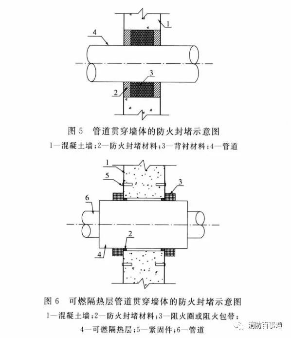 5.2 管道贯穿孔口的封堵5.2.1 熔点不低于1000℃且无绝热层的金属管道贯穿具有耐火性能要求的建筑结构或构件时,贯穿孔口的防火封堵应符合下列规定:1 环形间隙应采用无机或有机防火封堵材料封堵;或采用矿物棉等背衬材料填塞并覆盖有机防火封堵材料;或采用防火封堵板材封堵,并在管道与防火封堵板材之间的缝隙填塞有机防火封堵材料。2 贯穿部位附近存在可燃物时,被贯穿体两侧长度各不小于1.0m范围内的管道应采取防火隔热措施。5.2.2 熔点不低于1000℃且有绝热层的金属管道贯穿具有耐火性能要求的建筑结构或构件时,贯穿孔口的防火封堵应符合下列规定:1 当绝热层为熔点不低于1000℃的不燃材料或贯穿部位未采取绝热措施时,防火封堵应符合本标准第5.2.1条的规定;2 当绝热层为可燃材料,但被贯穿体两侧长度各不小于1.0m范围内的管道绝热层为熔点不低于1000℃的不燃材料时,防火封堵应符合本标准第5.2.1条的规定;3 当不符合本条第1款、第2款的规定时,环形间隙应采用矿物棉等背衬材料填塞并覆盖膨胀性的防火封堵材料;或采用防火封堵板材封堵,并在管道与防火封堵板材之间的缝隙填塞膨胀性的防火封堵材料。在竖向贯穿部位的下侧或水平贯穿部位两侧的管道上,还应设置阻火圈或阻火包带。5.2.3 熔点低于1000℃的金属管道贯穿具有耐火性能要求的建筑结构或构件时,其贯穿孔口防火封堵应符合下列规定:1 当为单根管道贯穿时,环形间隙应采用矿物棉等背衬材料填塞并覆盖膨胀性的防火封堵材料。对于公称直径大于50mm的管道,在竖向贯穿部位的下侧或水平贯穿部位两侧的管道上还应设置阻火圈或阻火包带。2 当为多根管道贯穿时,应符合本条第1款的规定;或采用防火封堵板材封堵,并在管道与防火封堵板材之间的缝隙填塞膨胀性的防火封堵材料。每根管道均应设置阻火圈或阻火包带。3 当在无绝热层的管道贯穿部位附近存在可燃物时,被贯穿体两侧长度各不小于1.0m范围内的管道还应采取防火隔热防护措施。5.2.4 塑料管道贯穿具有耐火性能要求的建筑结构或构件时,贯穿部位的环形间隙应采用矿物棉等背衬材料填塞并覆盖膨胀性的防火封堵材料;或采用防火封堵板材封堵,并在管道与防火封堵板材之间的缝隙填塞膨胀性的防火封堵材料。对于公称直径大于50mm的管道,还应在竖向贯穿部位的下侧或水平贯穿部位两侧的管道上设置阻火圈或阻火包带。5.2.5 耐火风管贯穿部位的环形间隙宜采用具有弹性的防火封堵材料封堵;或采用矿物棉等背衬材料填塞并覆盖具有弹性的防火封堵材料;或采用防火封堵板材封堵,并在风管与防火封堵板材之间的缝隙填塞具有弹性的防火封堵材料。5.2.6 管道井、管沟、管窿防火分隔处的封堵应采用矿物棉等背衬材料填塞并覆盖有机防火封堵材料;或采用防火封堵板材封堵,并在管道与防火封堵板材之间的缝隙填塞有机防火封堵材料。