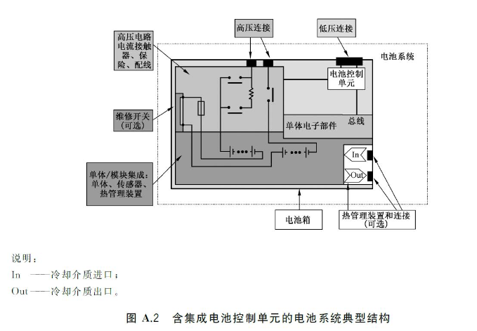 A.2 电池系统 电池系统是能量存储装置,包括电池单体或电池包、电路和电控单元(如电池控制单元、电流接触器)。电池系统的典型结构有两种,分别是集成了电池控制单元的电池系统和带外置电池控制单元的电池系统,分别如图A.2和图A.3所示。