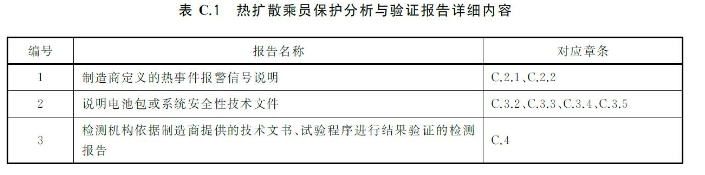 热扩散乘员保护分析与验证报告应包含表C.1所列3项报告,其中第1项和第2项由制造商提供,第3项由检测机构出具。