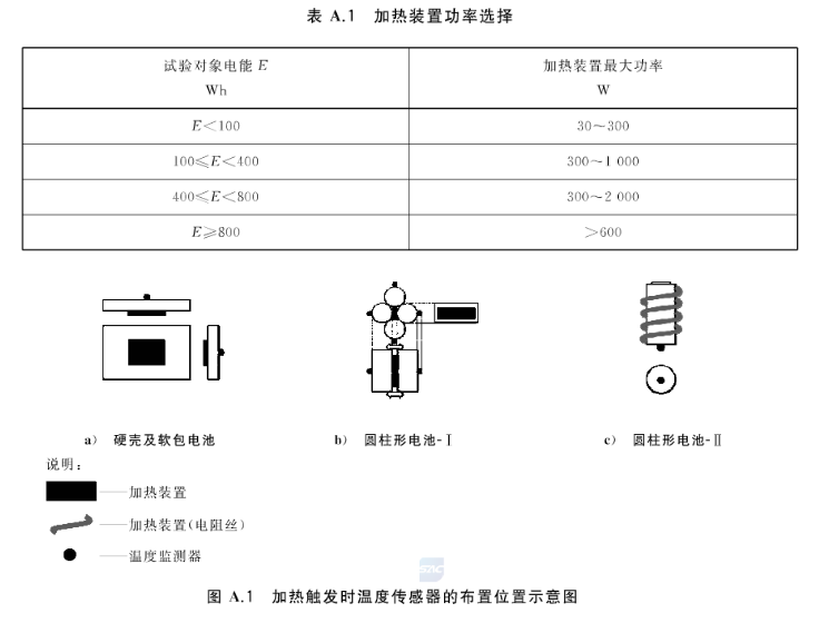 使用平面状或者棒状加热装置,并且其表面应覆盖陶瓷、金属或绝缘层,加热装置的功率要求见表A.1.完成试验对象与加热装置的裝配,加热裝置与蓄电池单体应直接接触,加热装置的尺寸规格应不大于试验对象的被加热面;安装温度监测器,监测点温度传感器布置在远离热传导的一侧,即安装在加热裝置的对侧(如图A.1所示)。温度数据的采样间隔应小于1s,准确度要求为士2℃,温度传感器尖端的直径应小于1mm。