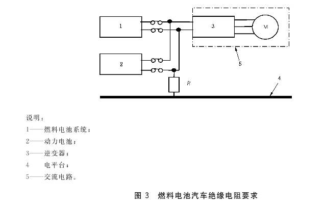 在最大工作电压下,直流电路绝缘电阻应不小于100Ω/V,交流电路应不小于500Ω/V。如果直流和交流的B级电压电路可导电的连接在一起,则应满足绝缘电阻不小于500Ω/V的要求。对于燃料电池电动汽车,如图3中所示。若交流电路增加有附加防护,则组合电路至少满足100Ω/V的要求附加防护方法应至少满足以下一种要求: