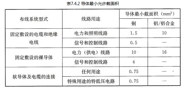 导体最小截面积应满足机械强度的要求,配电线路每一相导体截面积不应小于表7.4.2的规定。