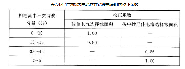 当三相四线制线路中存在谐波电流时,在选择中性导体截面积时应计入谐波电流的影响。当中性导体电流大于相导体电流时,电缆截面积应按中性导体电流选择。当中性导体电流大于相电流133%且按中性导体电流选择电缆截面积时,电缆载流量可不校正。当三相负荷平衡系统中存在谐波电流,4芯或5芯电缆中中性导体和相导体具有相同材料和截面积时,应按表7.4.4确定电缆载流量的校正系数。