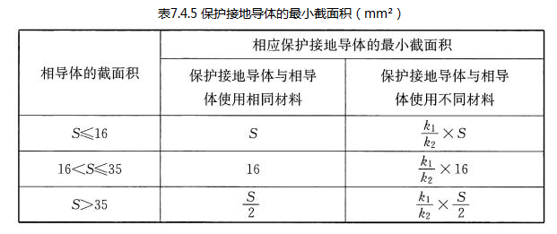保护接地导体的截面积,可按照公式(7.4.5)确定,也可按表7.4.5进行选择,并满足本条第3款3)项的要求;