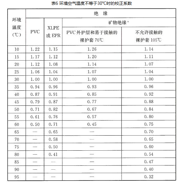 导体的允许载流量,应根据敷设处的环境温度进行校正,校正系数是按《低压电气装置第5-52部分:电气设备的选择和安装布线系统》GB/T16895.6-2014表B.52.14和表B.52.15的规定进行选取,见表6、表7。