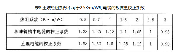 当土壤热阻系数与载流量对应的热阻系数不同时,敷设在土壤中的电缆载流量应进行校正,其校正系数是按《低压电气装置第5-52部分:电气设备的选择和安装布线系统》GB/T16895.6-2014表B.52.16的规定进行选取,见表8。