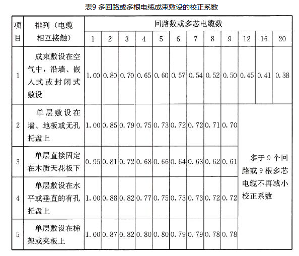 多回路或多根多芯电缆成束敷设的载流量校正系数应按《低压电气装置第5-52部分:电气设备的选择和安装布线系统》GB/T16895.6-2014表B.52.17的规定进行选取,见表9。